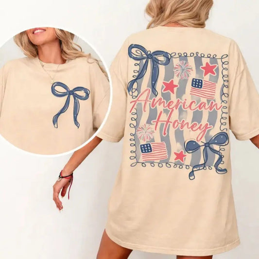 "American Honey" Coquette 4th Of July T-Shirt – Girly Vintage USA Graphic Tee, Premium 100% Cotton Independence Day Top, Made in USA